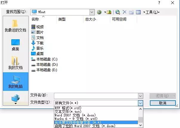 请点击“文件”——“打开”,在打开文件对话框中的文件类型下拉框中,选择“从任意文件中恢复文本”项(请将鼠标向下拖动,否则无法看到这个项目),再点击原先打不开的文件,耐心等待一会儿,凡是能够被恢复的文本,都会出现在Word窗口中,这时候就麻烦你按一下存盘图标吧!