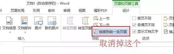 ➤双击进入正文第一页的页眉/页脚,如果前面设置目录的时候插入了分节符,我们就要点击取消“链接到前一条页眉”。